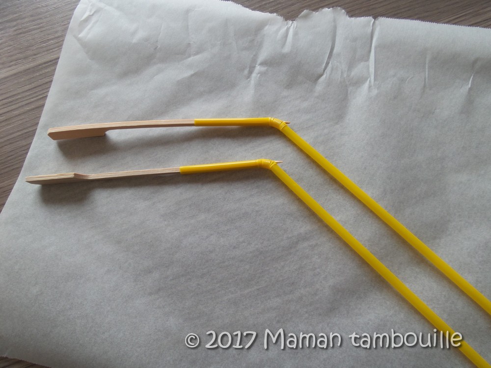 Couder les pailles et enfoncer les piques à brochettes dans le petit côté en les faisant ressortir un peu dans la paille pour garder la paille coudée.