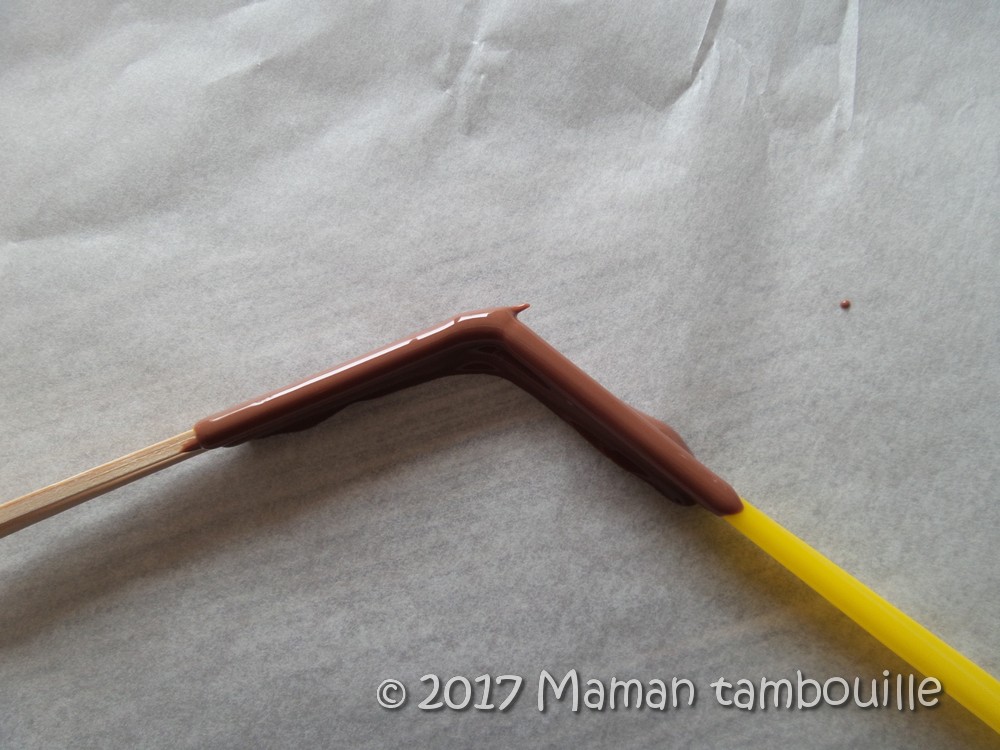 Faire fondre un peu de chocolat et en napper les 2 pailles pour les coller entre elles. Mettre sur une feuille de papier cuisson et placer 5 min au congélateur.