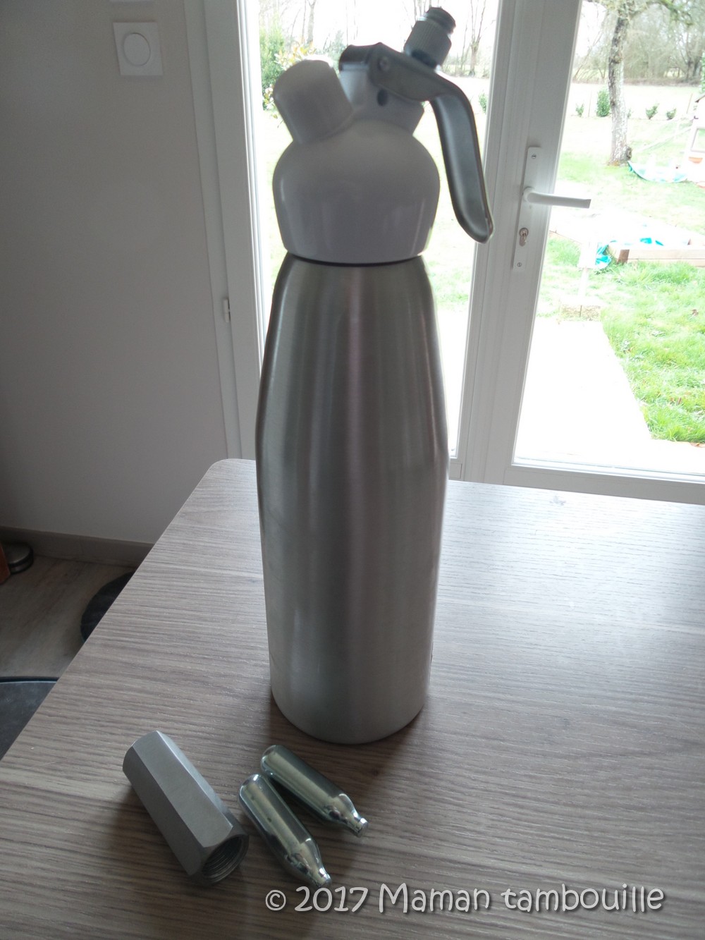 Préparer la chantilly: verser 2 cuillères à soupe de sucre glace dans un siphon (reçu d’AZ boutique) puis verser 100ml de crème. Bien mélanger puis verser les 300ml de crème restants. Mélanger. Fermer le siphon et percuter 1 (ou 2 pour un siphon d’1L) cartouches de gaz. Secouer 4-5 fois puis placer tête en bas au frigo pour 2h.
