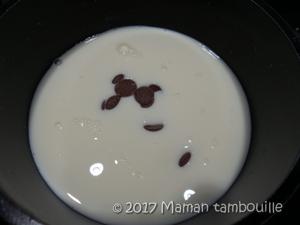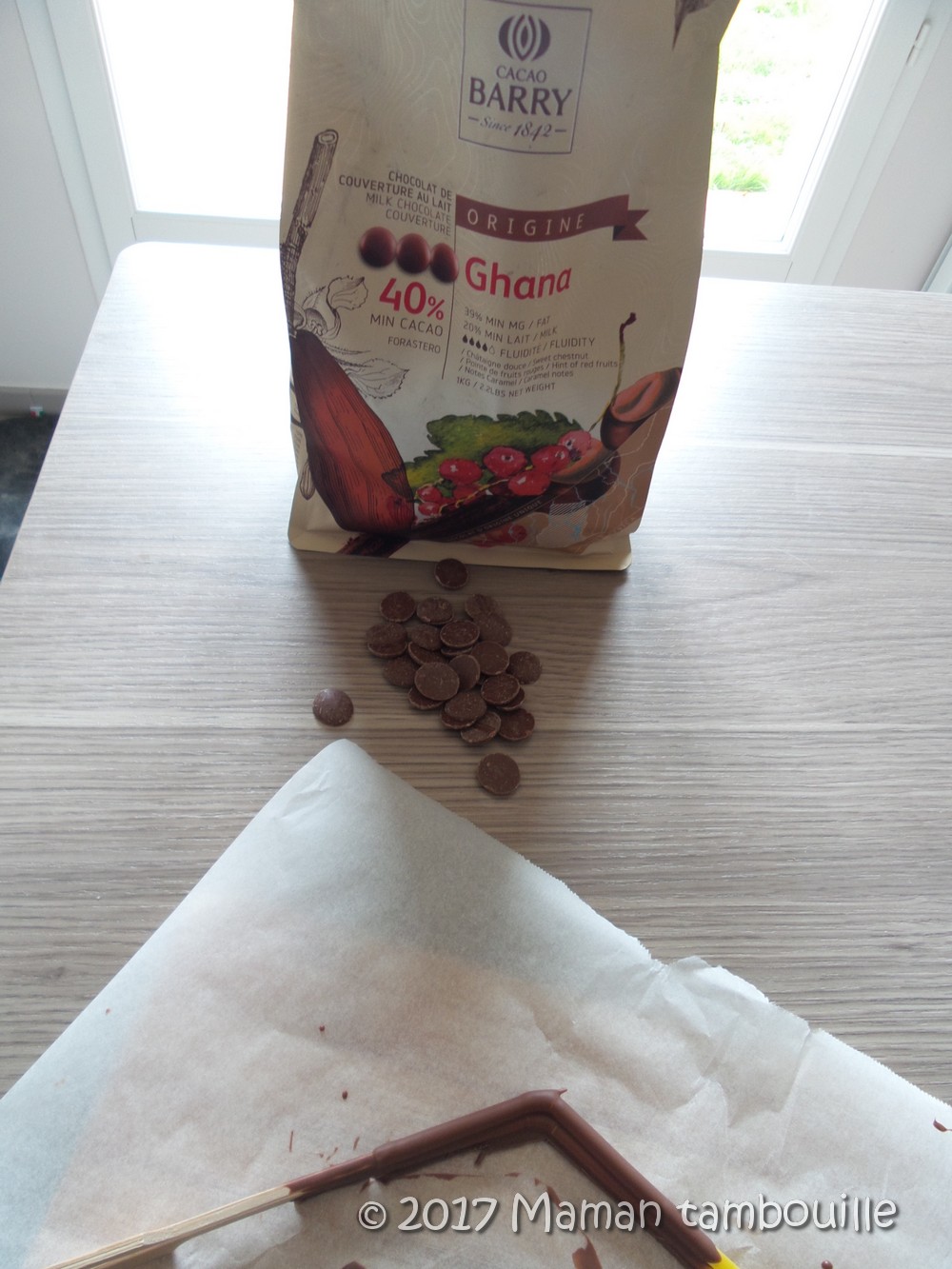 - 100g de chocolat au lait pâtissier en pistoles (Chocolat lait origine Ghana 40.5% 1kg) + environ 30g pour la déco