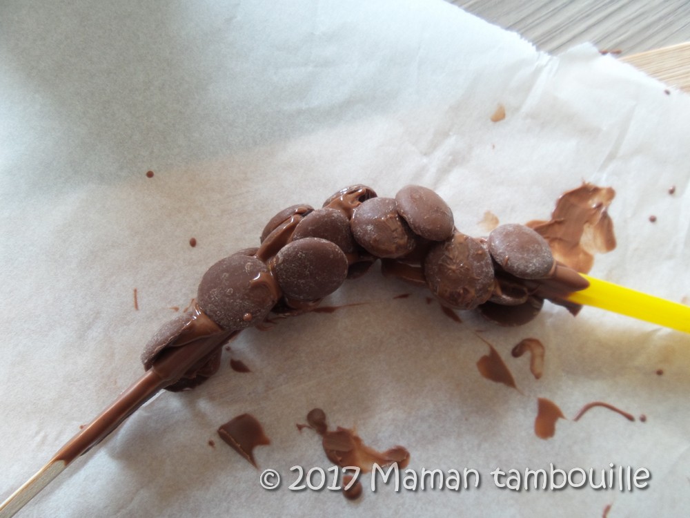 Sortir du congélateur. Remettre un peu de chocolat fondu sur les pailles et y coller des pistoles de chocolat.