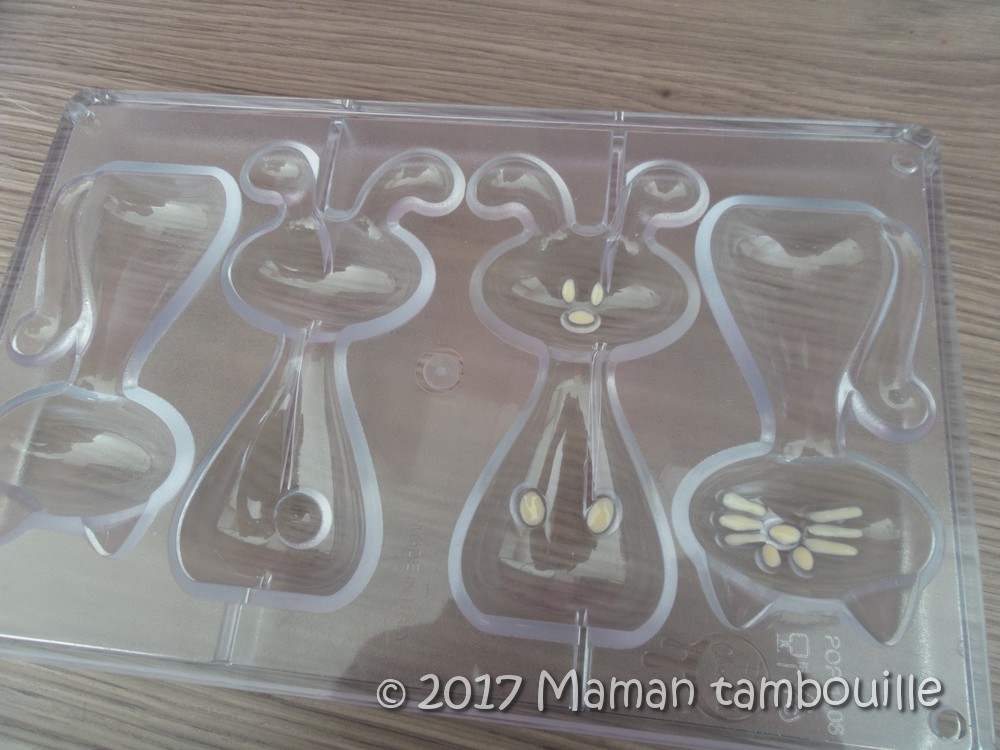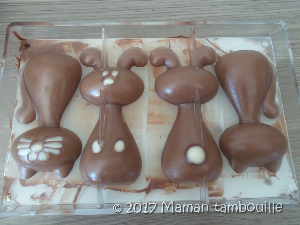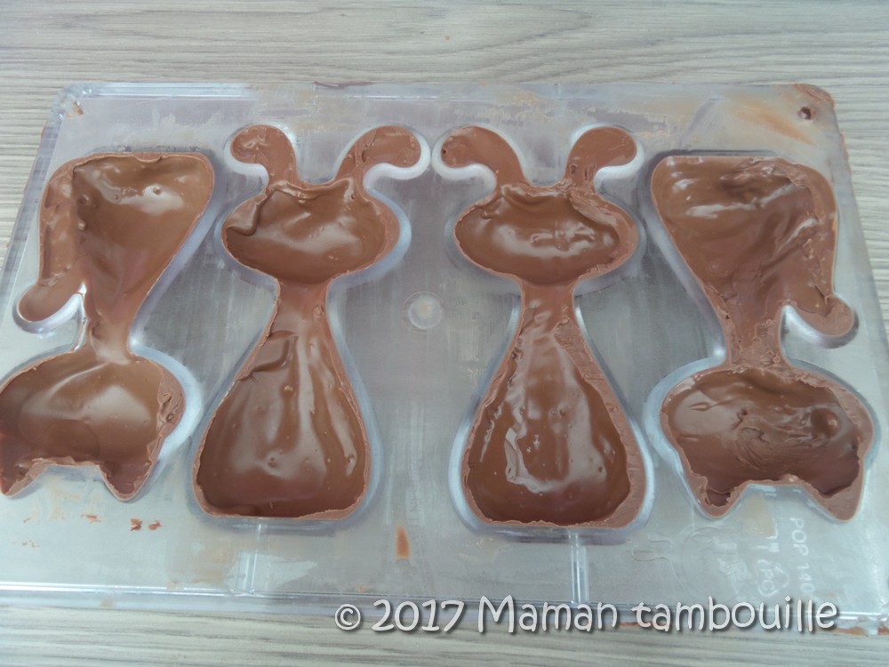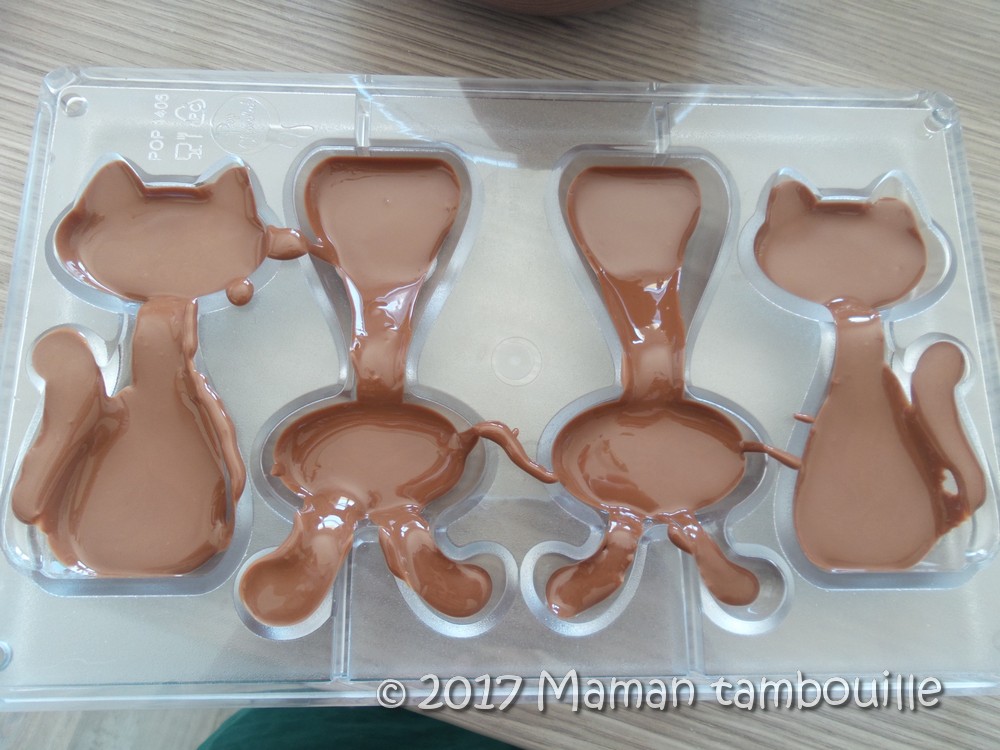 J’ai voulu faire des décors avec du chocolat blanc (les yeux, moustaches …). J’ai fait ma maligne en me disant « pas besoin de tempérage pour une si petite quantité ». Grossière erreur, au démoulage, le chocolat blanc est resté collé au fond du moule. Au final, j’ai « peint » mes personnages terminés avec un cure dent trempé dans le chocolat blanc pour rectifier le tir.