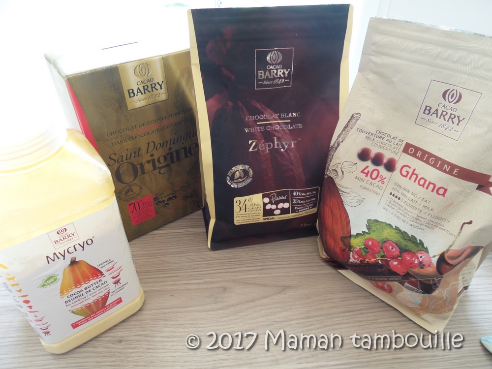 Pour faire mes coques en chocolat, j’utilisais jusqu’à maintenant des moules en silicone. Certes, les chocolats n’étaient pas parfaitement brillants mais au moins j’arrivais sans problème à les démouler. Avec les moules en polycarbonate, ça passe ou ça casse ! Si le chocolat ne veut pas se démouler et ben, on ne peut plus rien y faire, c’est foutu ! Ces moules imposent donc d’utiliser la technique du tempérage du chocolat mais également d’utiliser un chocolat de couverture de qualité. On peut oublier les tablettes de chocolat pâtissier dans ce cas, il faut vraiment investir dans du chocolat de couverture, plus riche en beurre de cacao. Pour ma part, je n’utilise que les chocolats de couverture Barry pour toutes mes préparations « sensibles ». Je réserve les simples tablettes aux fondants et autres gâteaux au chocolat. Et, petit plus pour se simplifier l’étape du tempérage: le mycryo. Mais je vous dirais tout ça dans la recette.