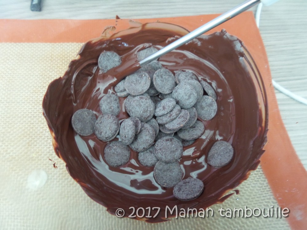 On ajoute 50g de chocolat noir, on mélange et on laisse descendre la température à 36°.
