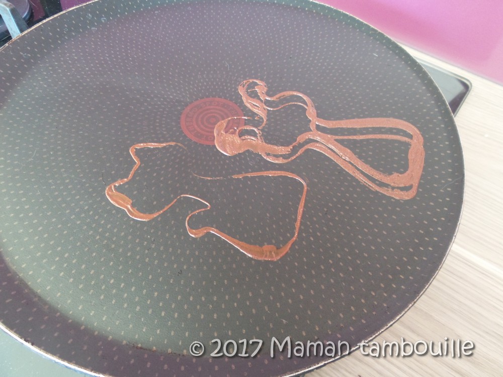 Déposer une partie de coque sur la poêle 2 secondes puis la retirer et la coller aussitôt à sa moitié. Il faut être rapide donc je n’ai pas de photos, j’ai juste l’état de la poêle après pour vous montrer la marque du chocolat juste fondu.