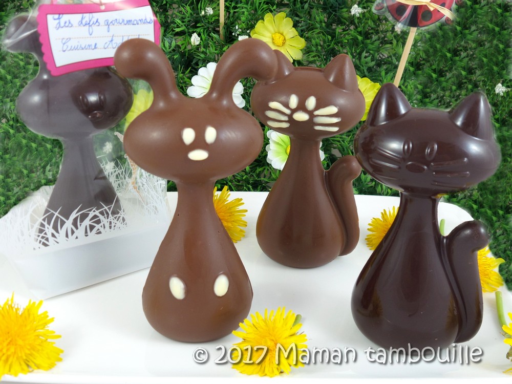 Il fallait utiliser ce mois-ci le Moule à Chocolat en Polycarbonate Lapin et Chat de Pâques et donc préparer des chocolats moulés pour Pâques.