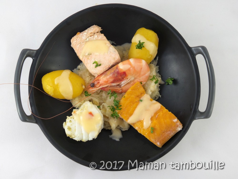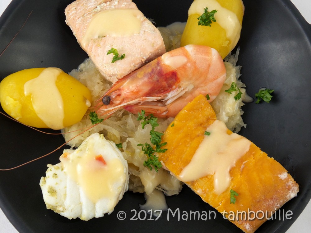 Ça faisait un bout de temps déjà que j’avais une grosse envie de choucroute de la mer ! Un plat qui n’est pas compliqué à faire bien qu’il faille une bonne logistique dans la préparation qui se fait principalement au dernier moment.