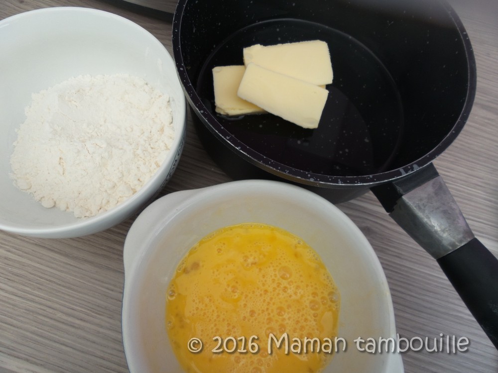- 125g d’œufs entiers légèrement battus (Casser 3 oeufs moyens, les battre un peu et peser pour ne garder que 125g)