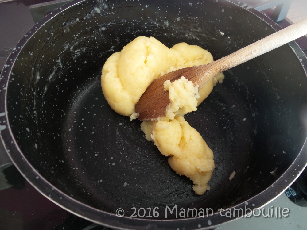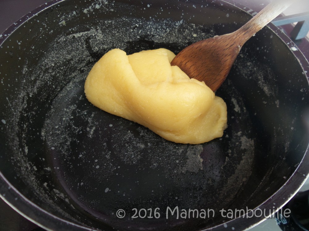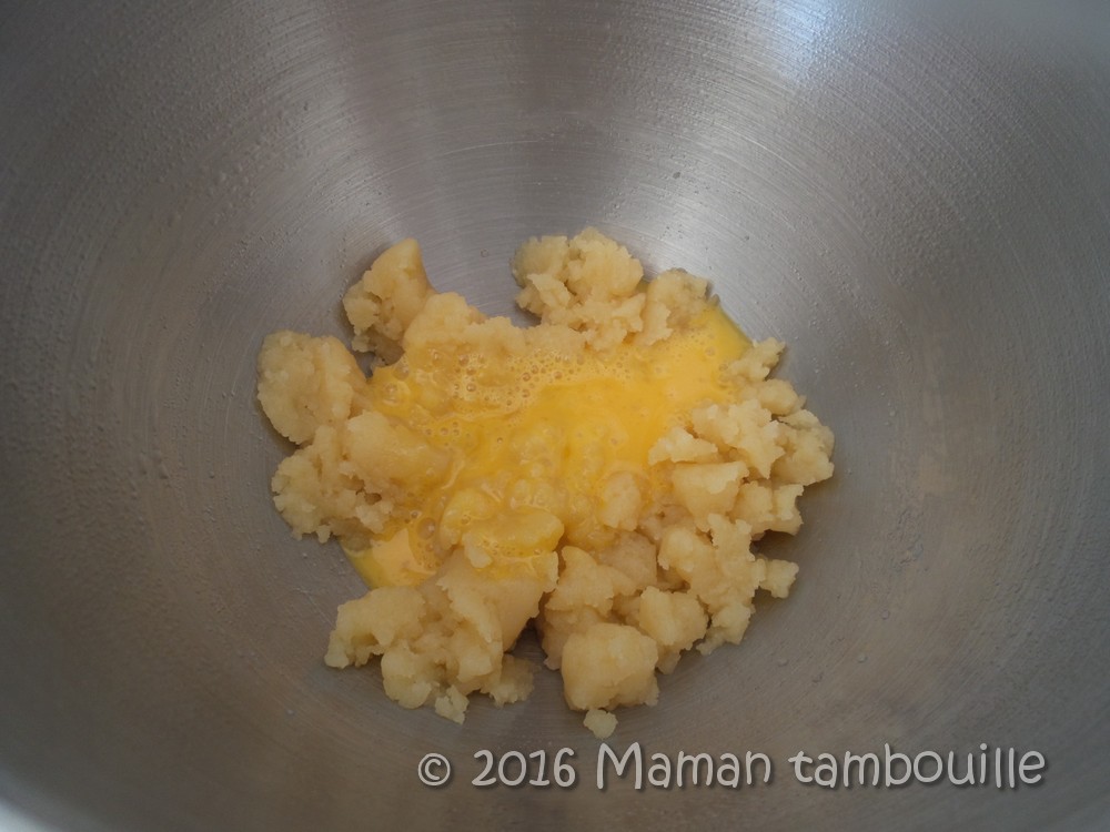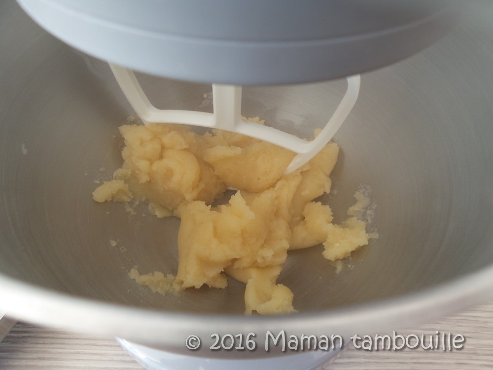 Mettre le pâton dans le bol du robot muni du fouet plat et faire tourner quelques instants pour le refroidir un peu.