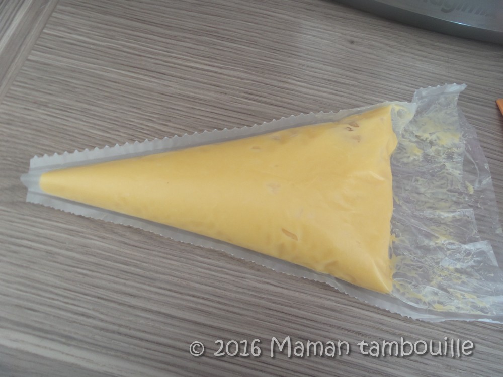 Mettre la pâte dans une poche à douille (personnellement, je ne mets pas de douille pour les choux, j’utilise la poche à douille tel quel).
