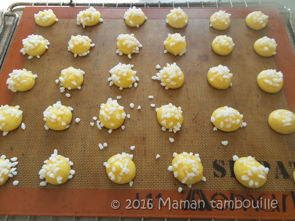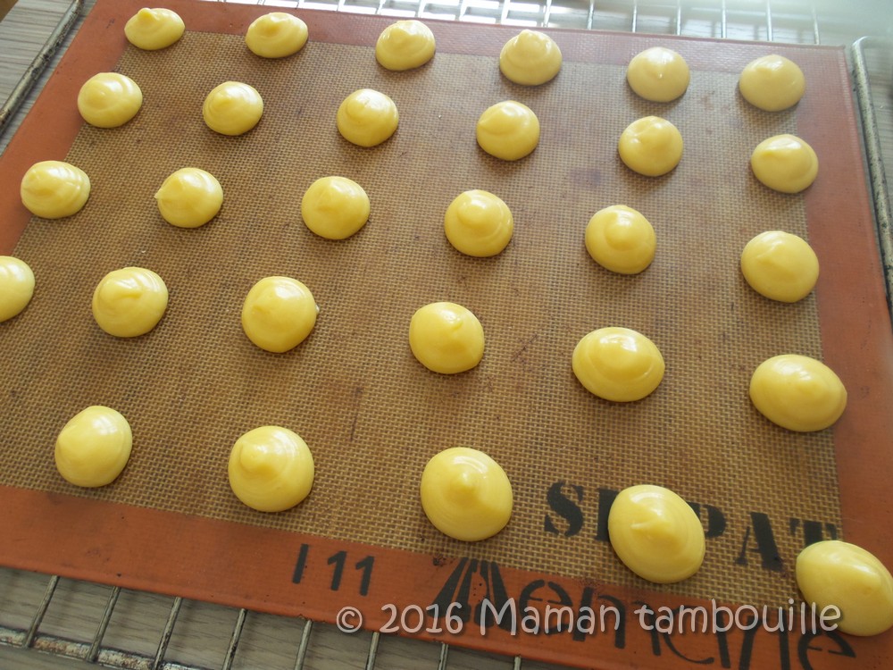 Sur une plaque de cuisson recouverte de papier sulfurisé, dresser des choux de 3 cms de diamètre environ (essayer de faire des choux de taille régulière).