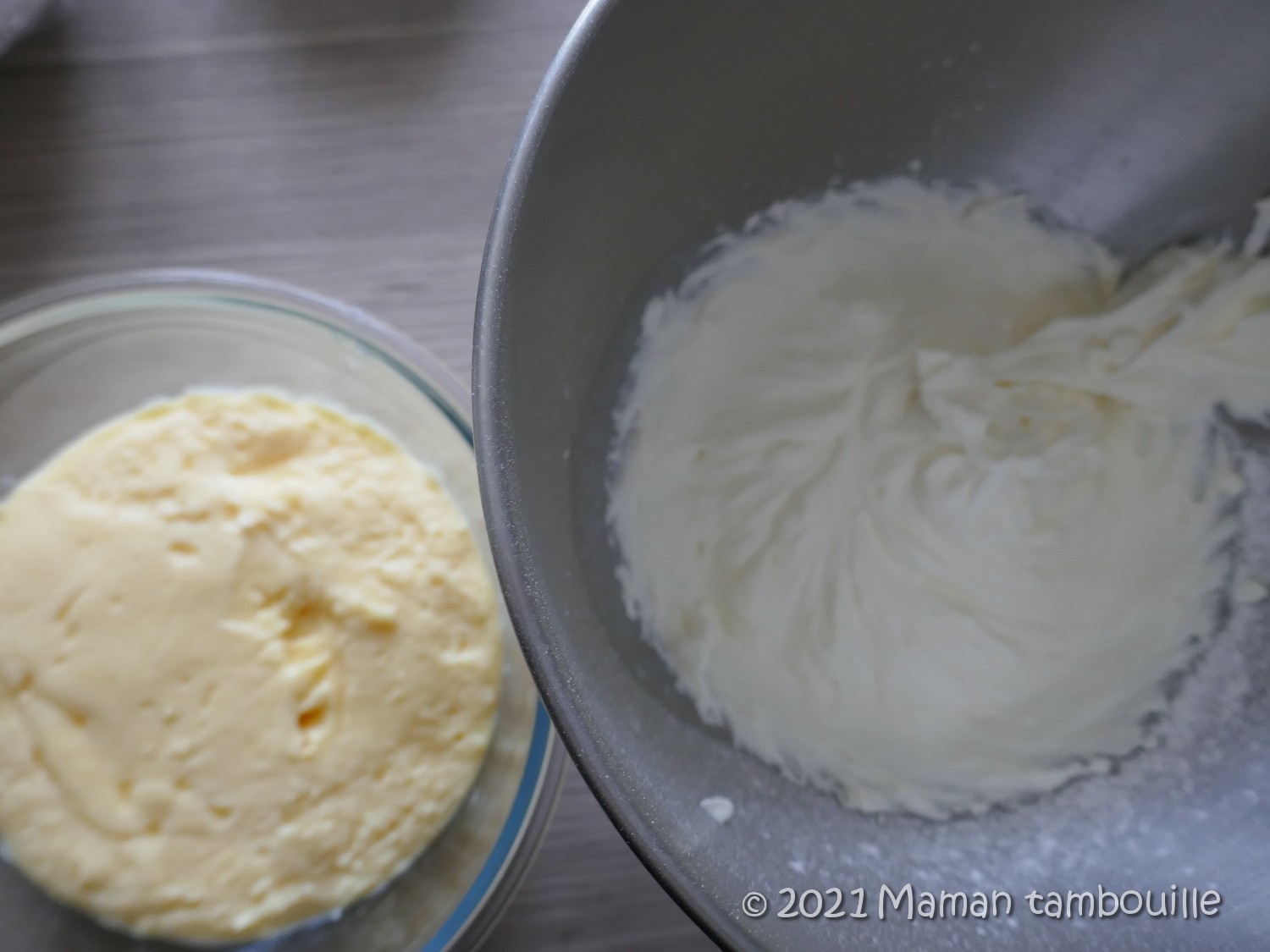 Fouetter la crème pâtissière pour l’assouplir et la rendre bien lisse. Ajouter 1/3 de la crème fouettée et incorporer délicatement. Finir avec le reste de crème fouettée.