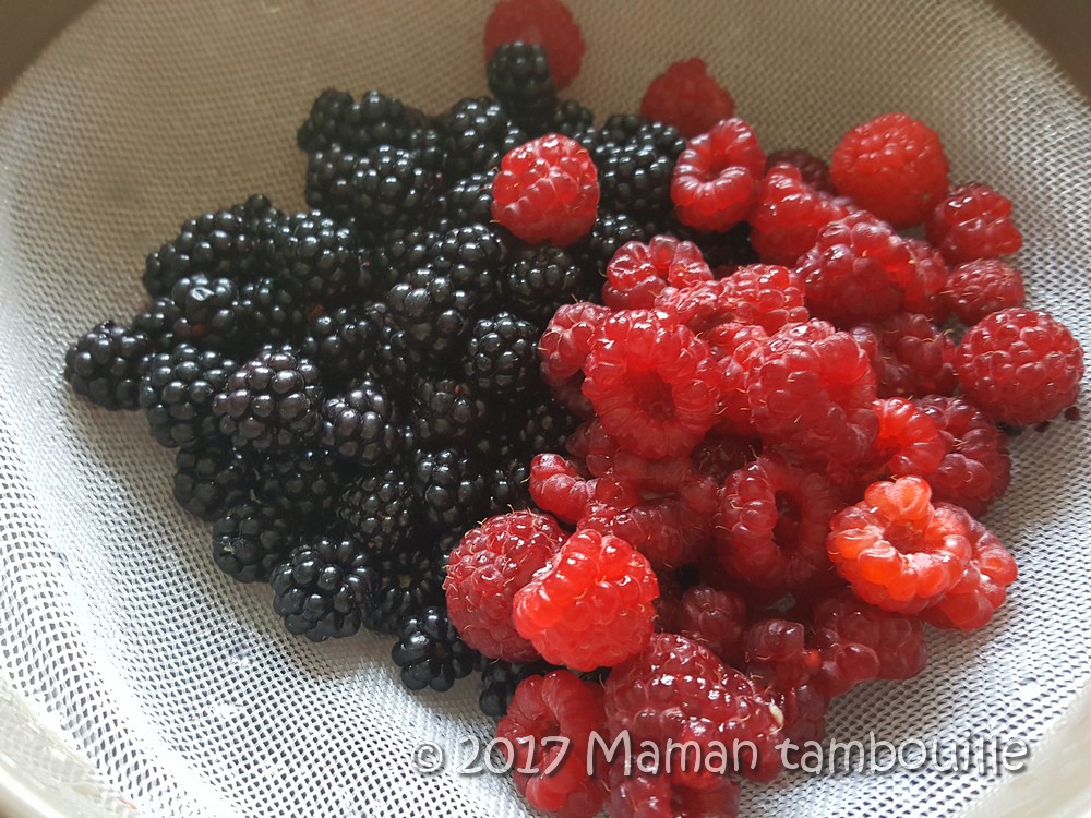 Vite vite, je publie cette recette avant que la saison des mûres et des framboises soit totalement terminée ! Elle l’est déjà dans certaines régions mais j’imagine que dans le sud, il doit encore y en avoir un peu, vu que mon framboisier livre encore à ce jour ses dernières merveilles.