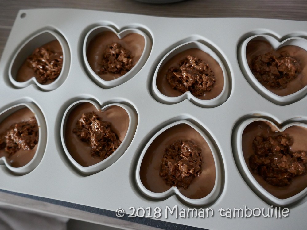 Une première recette pour tester mon nouveau moule coeur Silikomart. J’ai choisi de faire des coeurs mousse de chocolat caramel, garni d’un croustillant praliné et posés sur une base biscuits et flocon d’avoine. Un joli glaçage brillant pour la finition et voilà, le dessert est prêt 😉