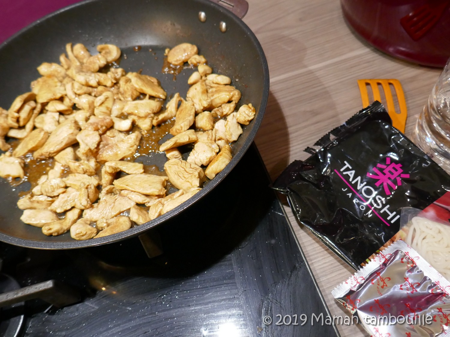 Dans une poêle, faire saisir les 2 autres escalopes de poulet coupées en morceaux. Ajouter un sachet d’épices des ramens (il y a 2 sachets par paquet) et un demi verre d’eau.