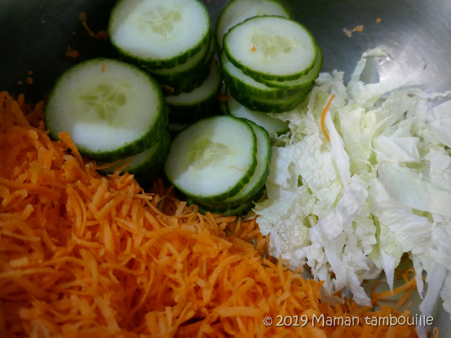 Emincer le concombre en rondelles. Râper les 2 carottes et émincer le chou chinois.