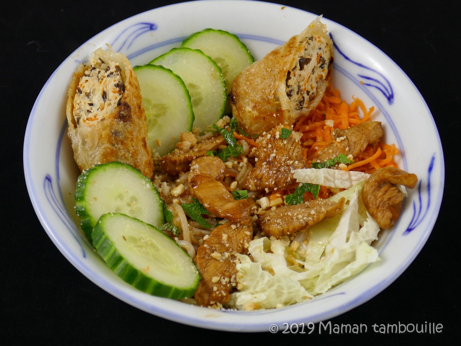 J’avais envie d’un plat avec de la fraîcheur mais aussi de la gourmandise. Sous la main, j’avais du concombre, des carottes, un reste de chou chinois et des blancs de poulet. En même temps, j’ai reçu dans la dernière Degusta Box des ramen Tanoshi que je me voyais bien associer à mes autres ingrédients et les faire un peu comme un bobun. Et voilà, l’idée de base était trouvée ! Mais qui dit bobun dit nems ! Ça tombe bien, j’ai toujours dans mes placards des feuilles de riz, des champignons noirs et du vermicelle de riz (et oui, ces ingrédients font partis des indispensables en stock au même titre que la farine ou les pâtes 😉 ).