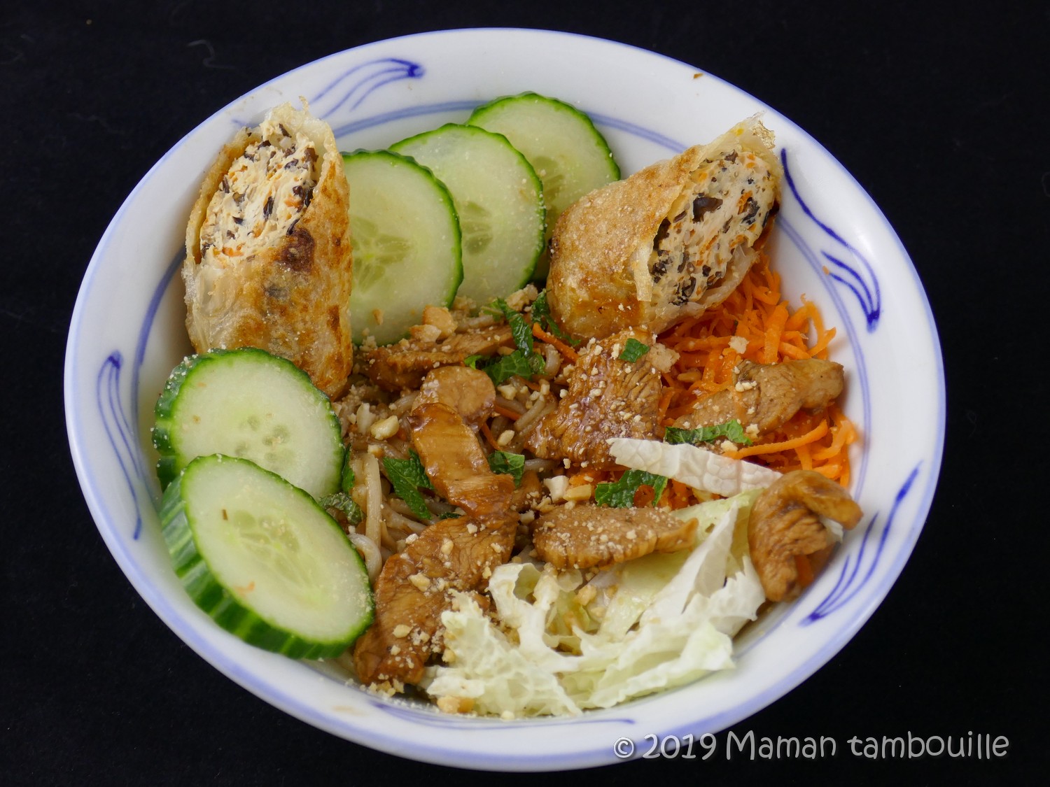 Servir un grand bol par personne avec des ramens chauds dans le fond, du poulet, des rondelles de concombre, des carottes râpées, du chou chinois. Ajouter un ou 2 nems coupés en 2.