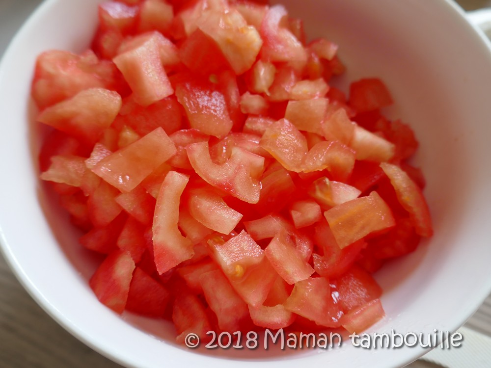 Eplucher, épépiner et couper en petits morceaux les tomates.