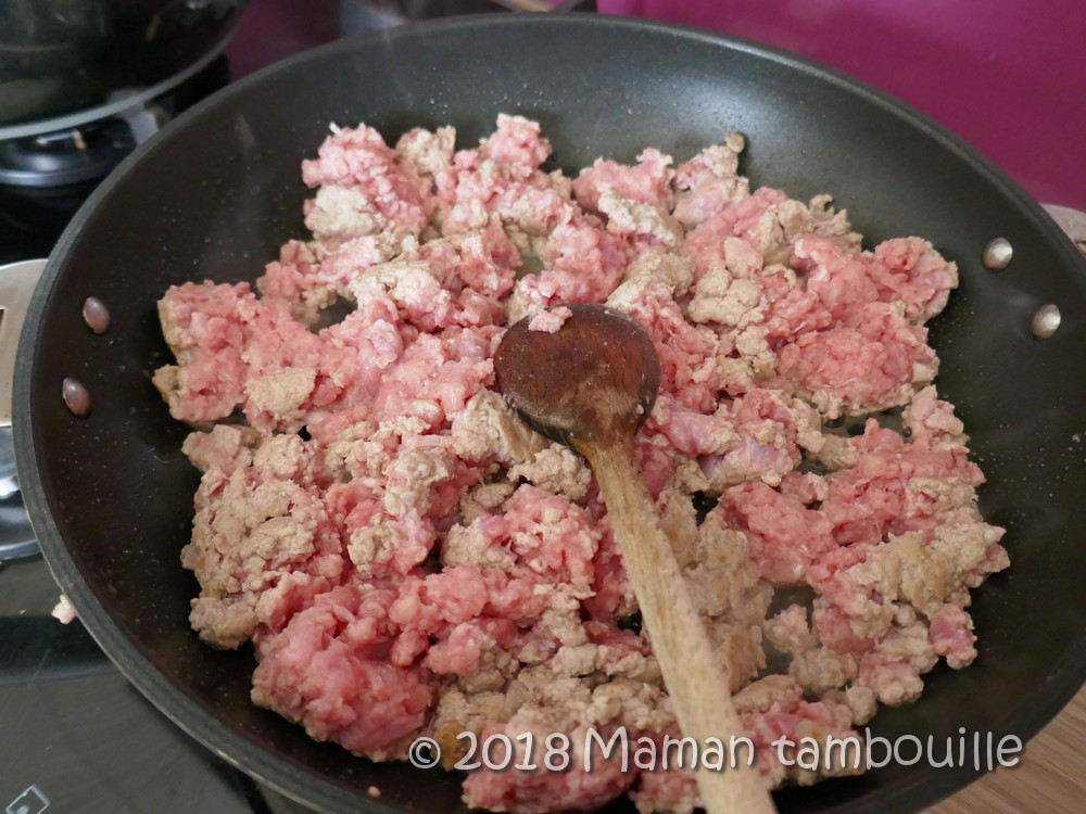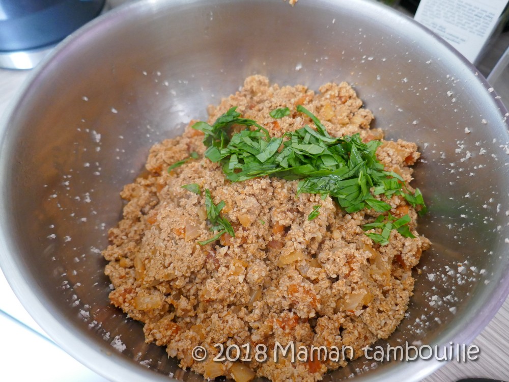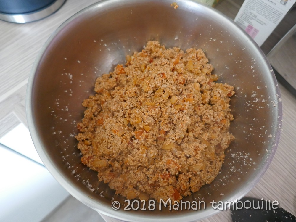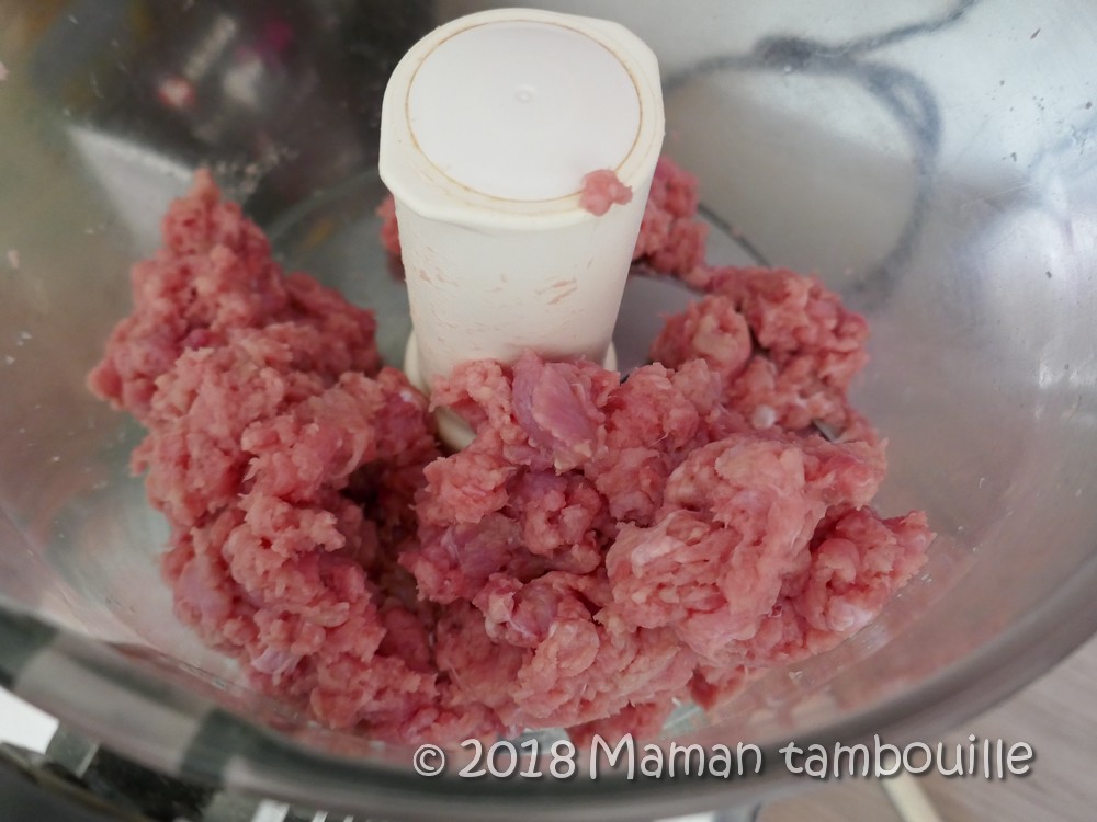 J’ai choisi de mixer à nouveau la viande cuite pour avoir une farce fine que je trouve plus agréable.
