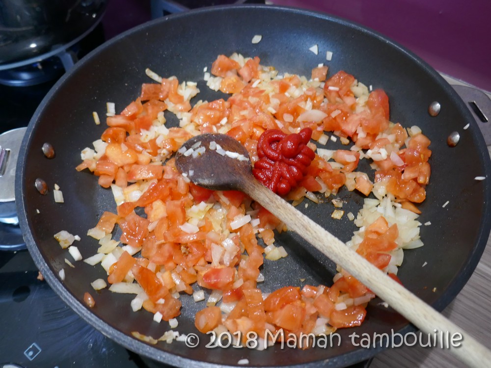 Ajouter une gousse d’ail émincée et les 3/4 des tomates. Ajouter 4 cuillères à soupe de concentré de tomate.