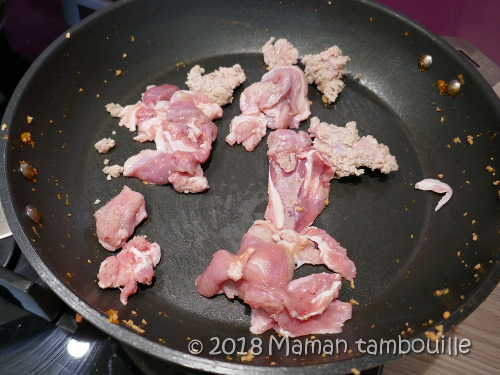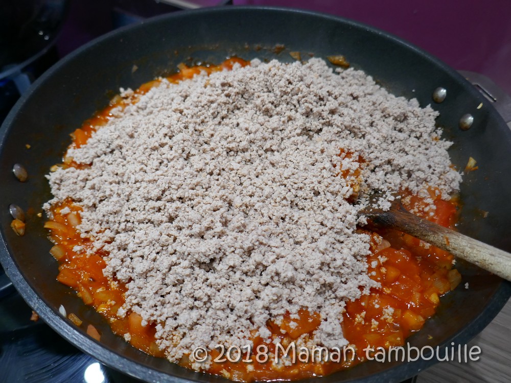 Ajouter la viande dans la casserole et mijoter 10 min à feu doux. Si la préparation est trop sèche, rajouter un peu d’eau.