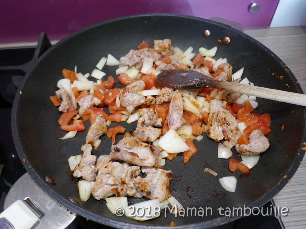Quand le veau est doré, ajouter un oignon émincé et le reste des tomates. Faire revenir 5 min.