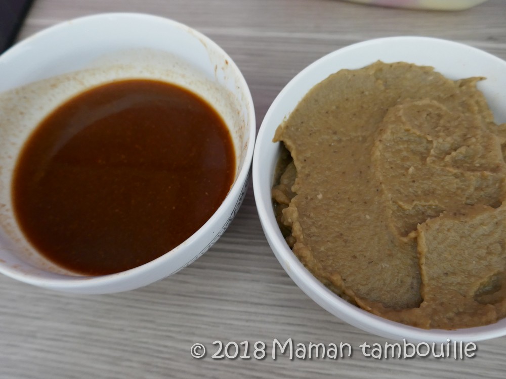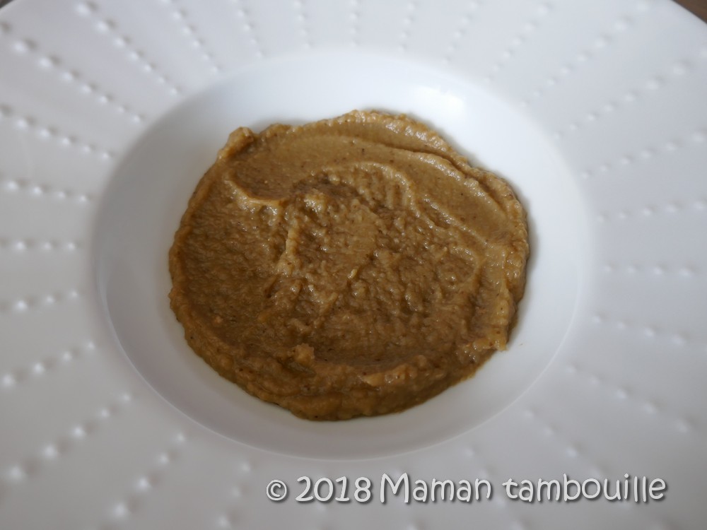 Gratter l’intérieur avec une cuillère et mettre le tout dans un robot mixeur. Ajouter un peu d’huile d’olive et assaisonner de sel … Mixer finement et rectifier l’assaisonnement si besoin. Réserver.