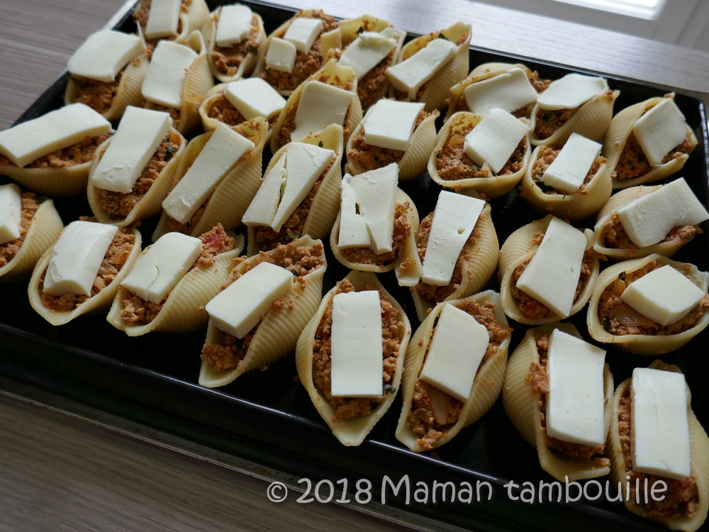 J’ai trouvé intéressante la recette de Philippe Etchebest dans le dernier épisode de Cauchemar en cuisine. Je n’en avais pas réalisée depuis longtemps car les dernières recettes ne me tentaient pas vraiment. Cette fois, il était question de conchiglioni farcis et ça tombe à pic car, dans mon élan « vidage de placard », il me restait justement un paquet de conchiglioni que je voulais finir.