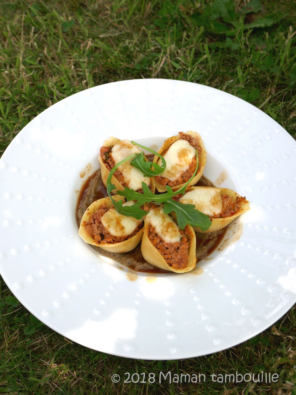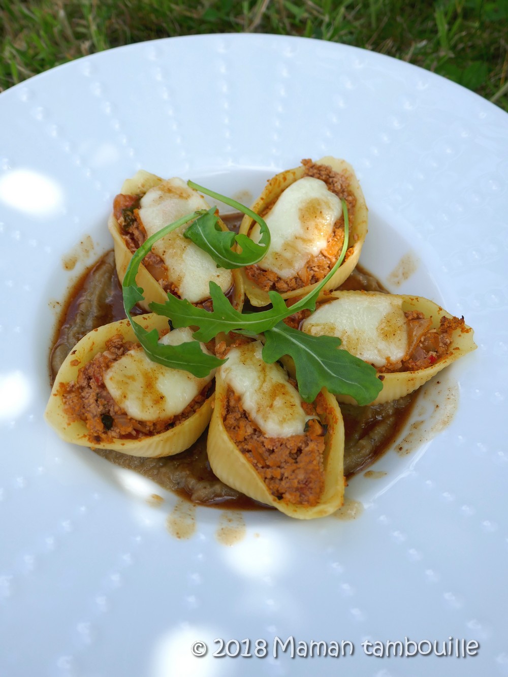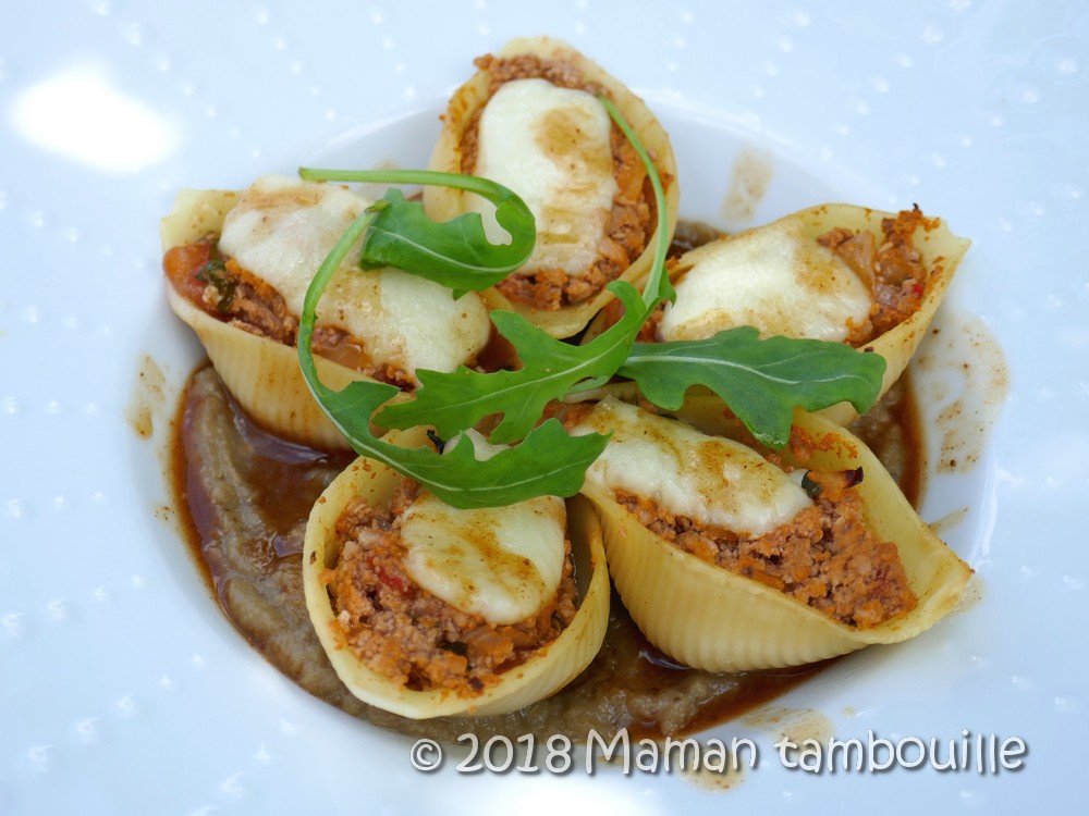 Pour ceux qui n’ont pas vu l’émission, je vous résume dans les grandes lignes le contenu de l’assiette: un lit de caviar d’aubergines, des conchiglioni farcis d’une préparation de veau et agrémentés d’une tranche de mozzarella et une sauce au marsala.