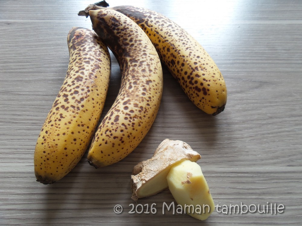 Il me restait des bananes qui commençaient à fatiguer et je n’avais pas envie d’en faire un cake. Alors, pourquoi de ne pas essayer une confiture de banane ? Il me restait également un morceau de gingembre que j’ai décidé d’ajouter à ma confiture.