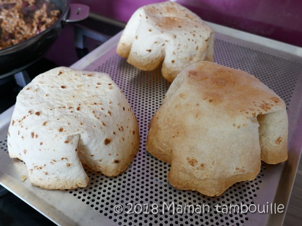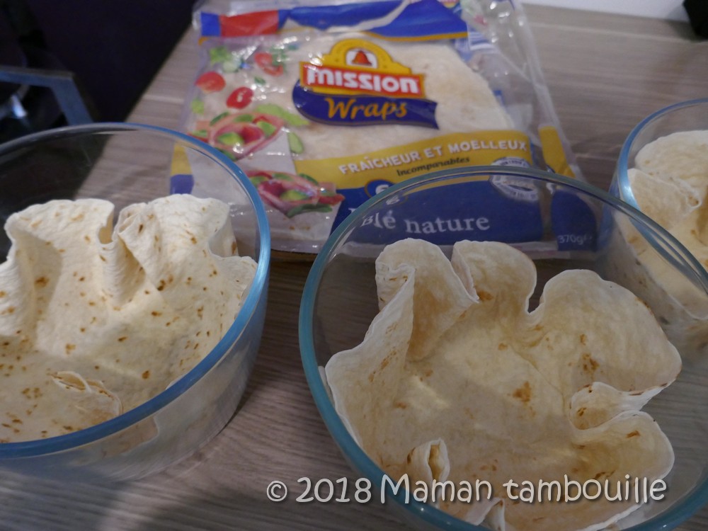 Enfoncer les wraps dans des saladiers ronds qui passent au four (j’ai 3 saladiers donc j’ai fait 2 tournĂ©es de 3 wraps).