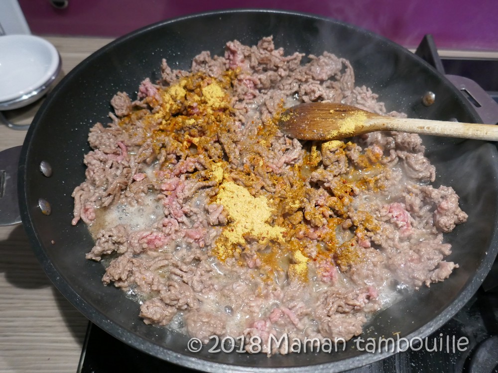 Quand le boeuf a commencé à bien cuire, ajouter les épices et laisser mijoter 5 min.