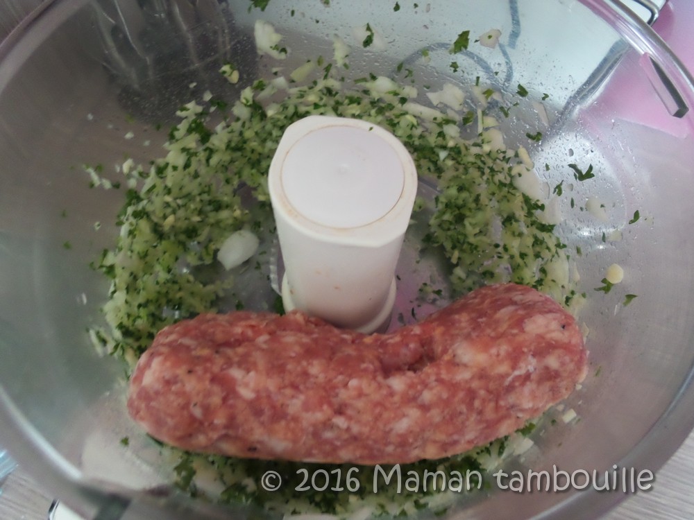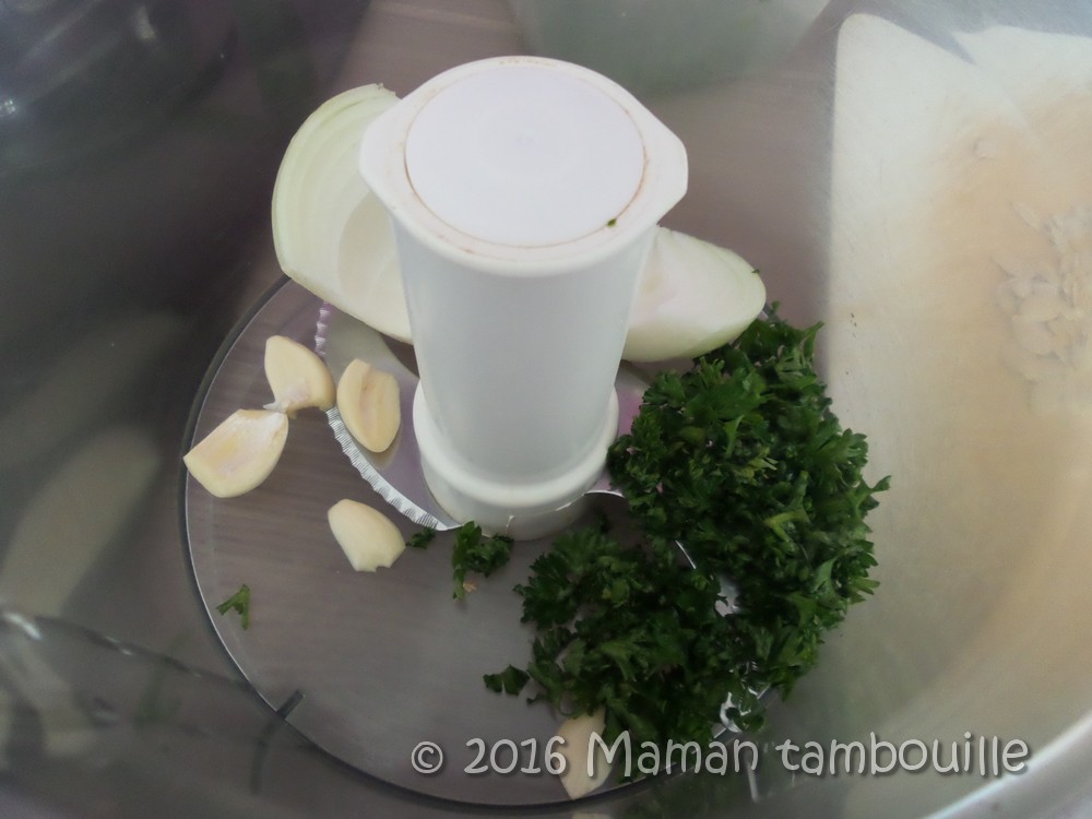 Dans le bol d’un robot mixeur, mettre l’oignon coupé en 4, l’ail dégermée et 3-4 cuillères à soupe de persil. Mixer par impulsions.