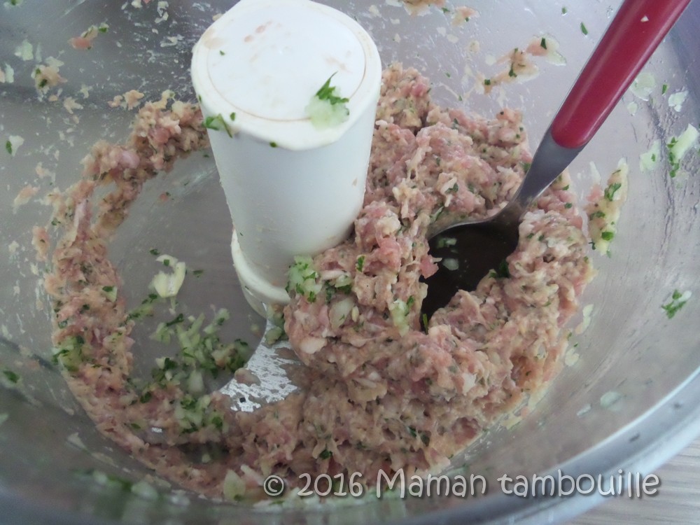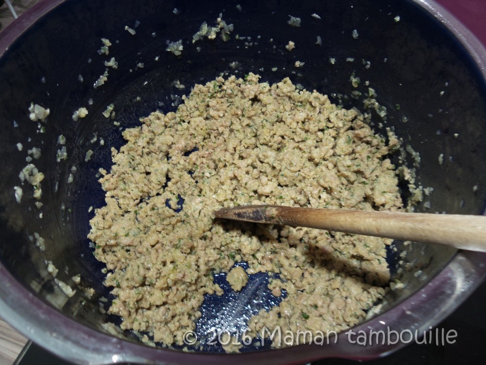Cuire la farce dans une cocotte avec de l’huile d’olive en mélangeant sans cesse pour éviter d’avoir de gros morceaux.