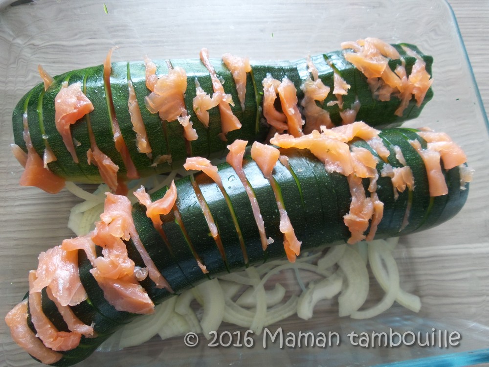 Enfoncer un morceau de saumon entre chaque entaille de courgette en faisant attention de ne garder la courgette entière.