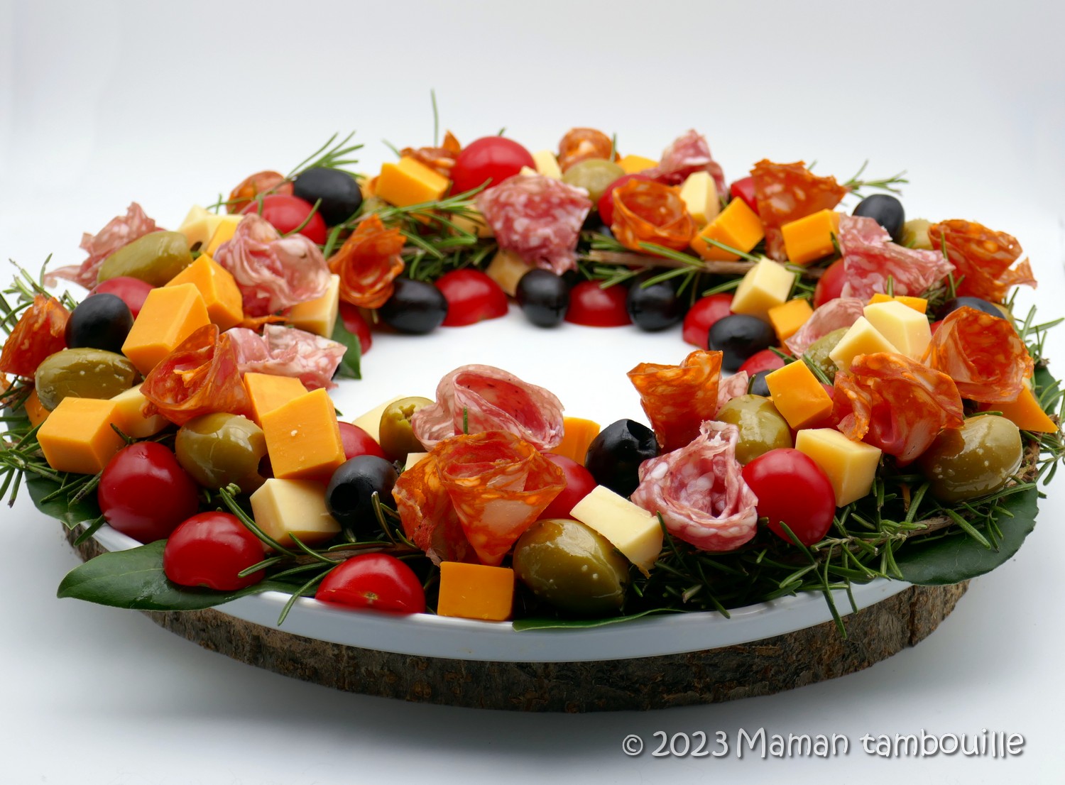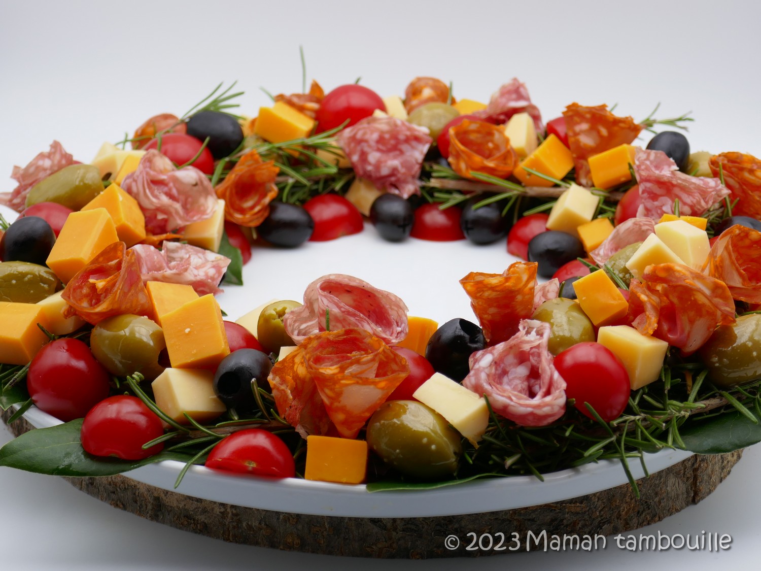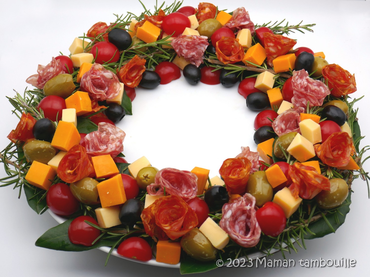 Oui oui, on est en avril mais il n’est jamais trop tard pour publier les recettes faites à Noël. Ici, une couronne apéritive type couronne de Noël mais bon, pourquoi la réserver uniquement à Noël ? Pâques approche, les beaux jours aussi avec les apéros dinatoires. Bref, j’aime beaucoup cette couronne que l’on agrémente un peu comme on veut …
