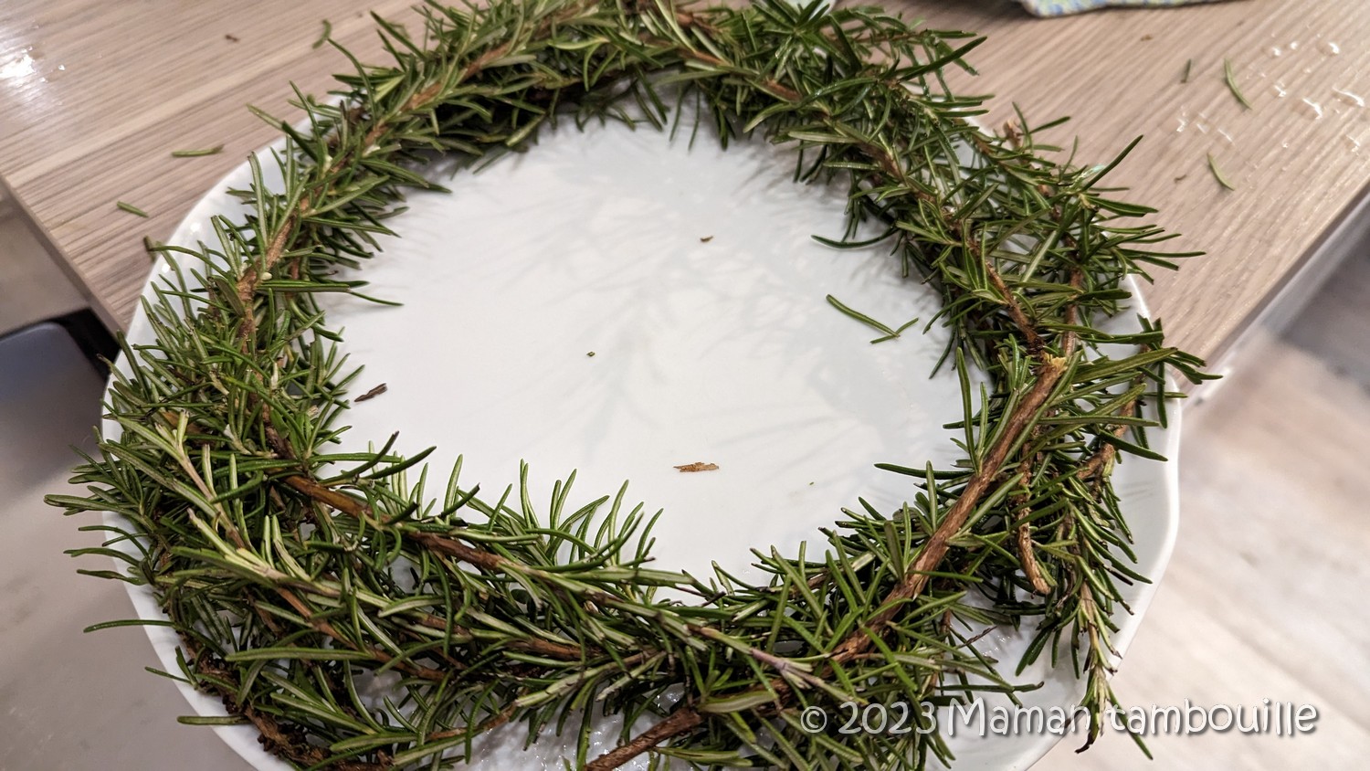 Disposer les feuilles de romarin en couronne dans un grand plat rond.