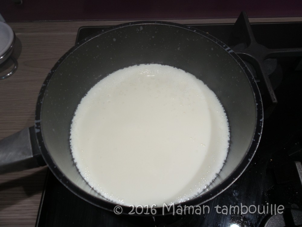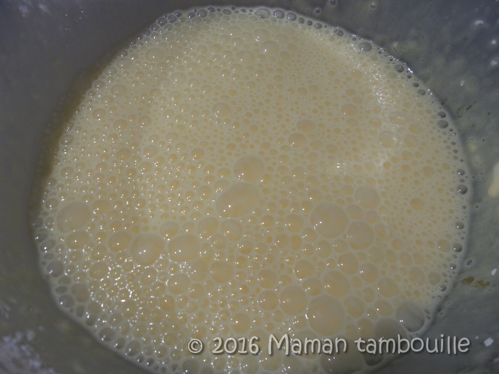 Porter le lait à ébullition. Dès que ça bout, le verser dans le saladier tout en fouettant.