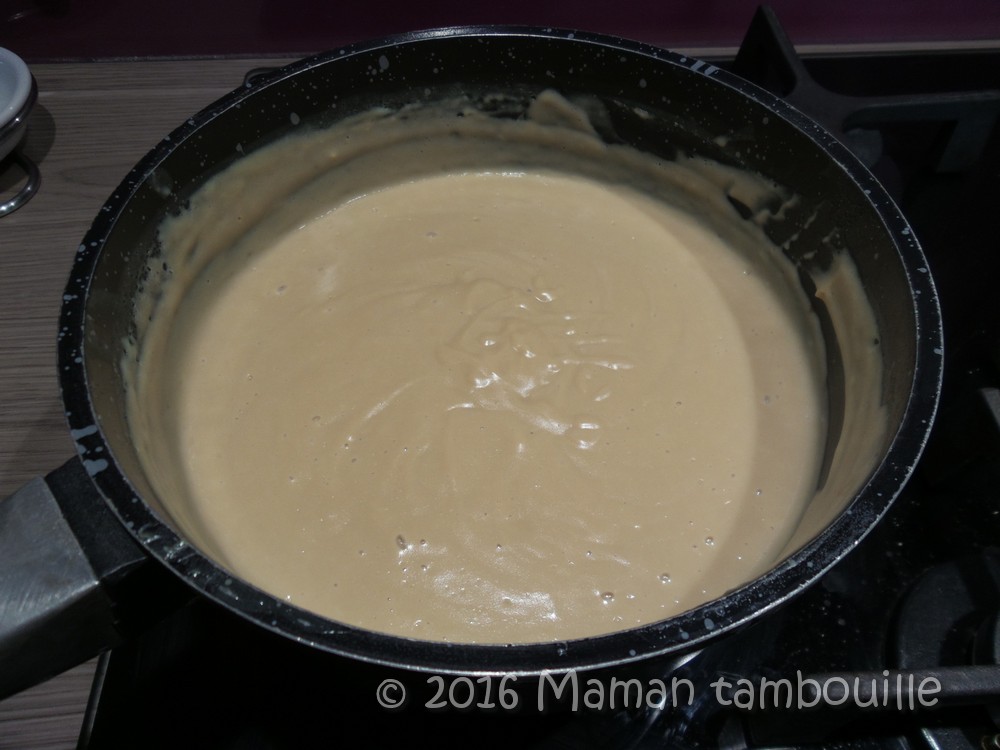 Remettre dans la casserole et cuire à feu moyen en mélangeant sans cesse jusqu’à ce que la crème épaississe (comme une crème pâtissière).
