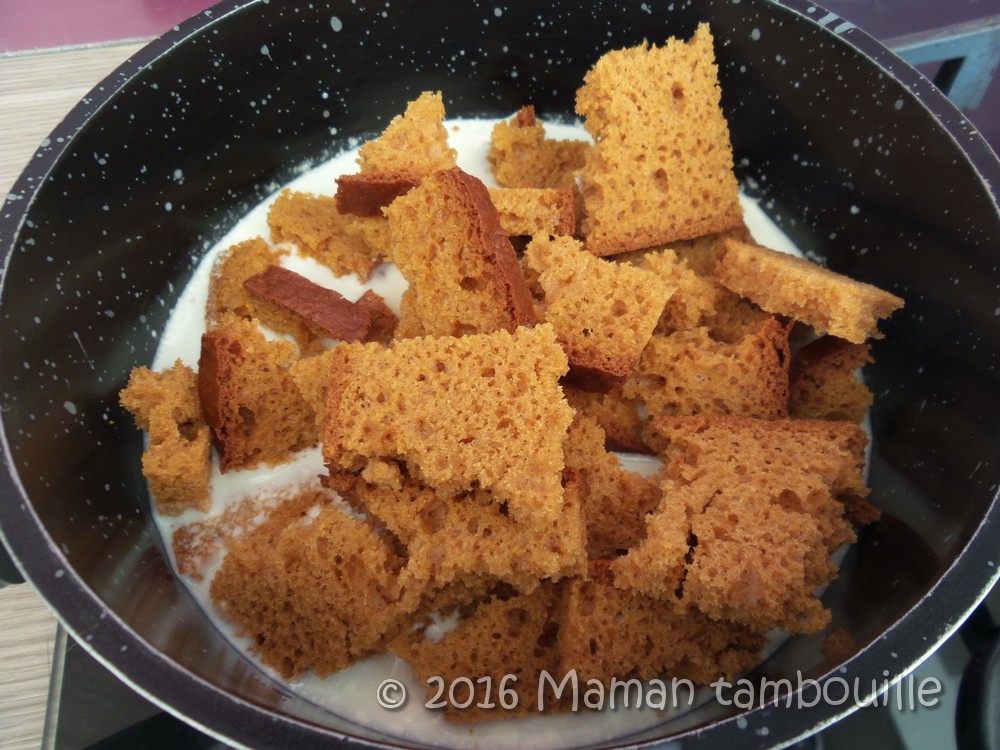 Dans une casserole, verser le reste de lait et la crème. Ajouter le sucre vanillé et le pain d’épices. Faire chauffer.