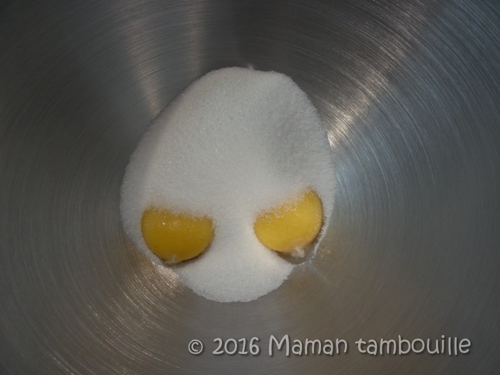 Au batteur électrique, faire blanchir les jaunes d’oeufs avec le sucre en poudre.
