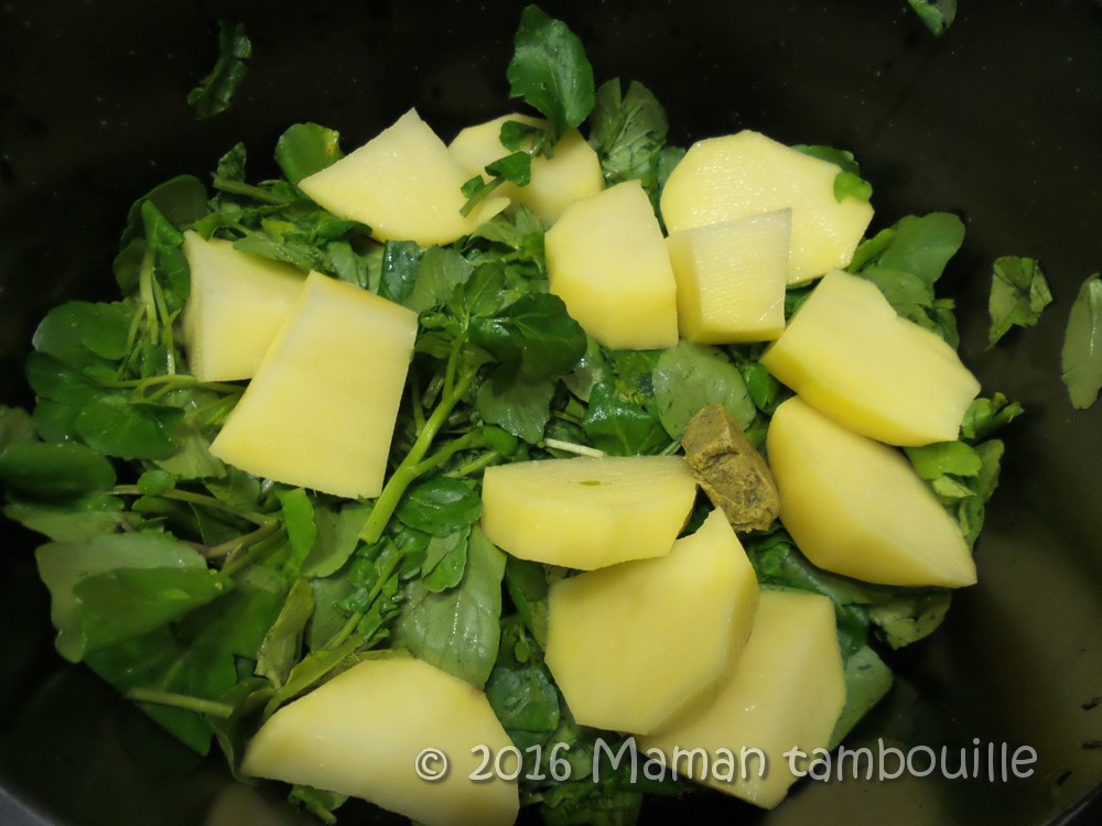 Laver soigneusement le cresson et retirer les plus grosses tiges. Le mettre dans une cocotte.