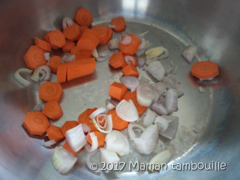 Dans une cocotte, mettre 2 échalotes émincées, 2 gousses d’ail coupées en morceaux et les carottes en rondelles.