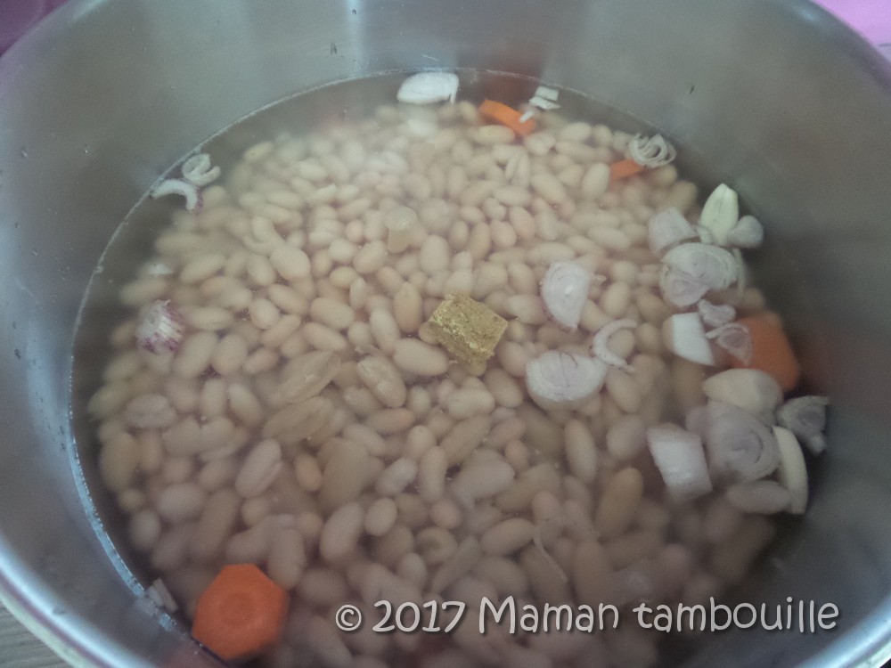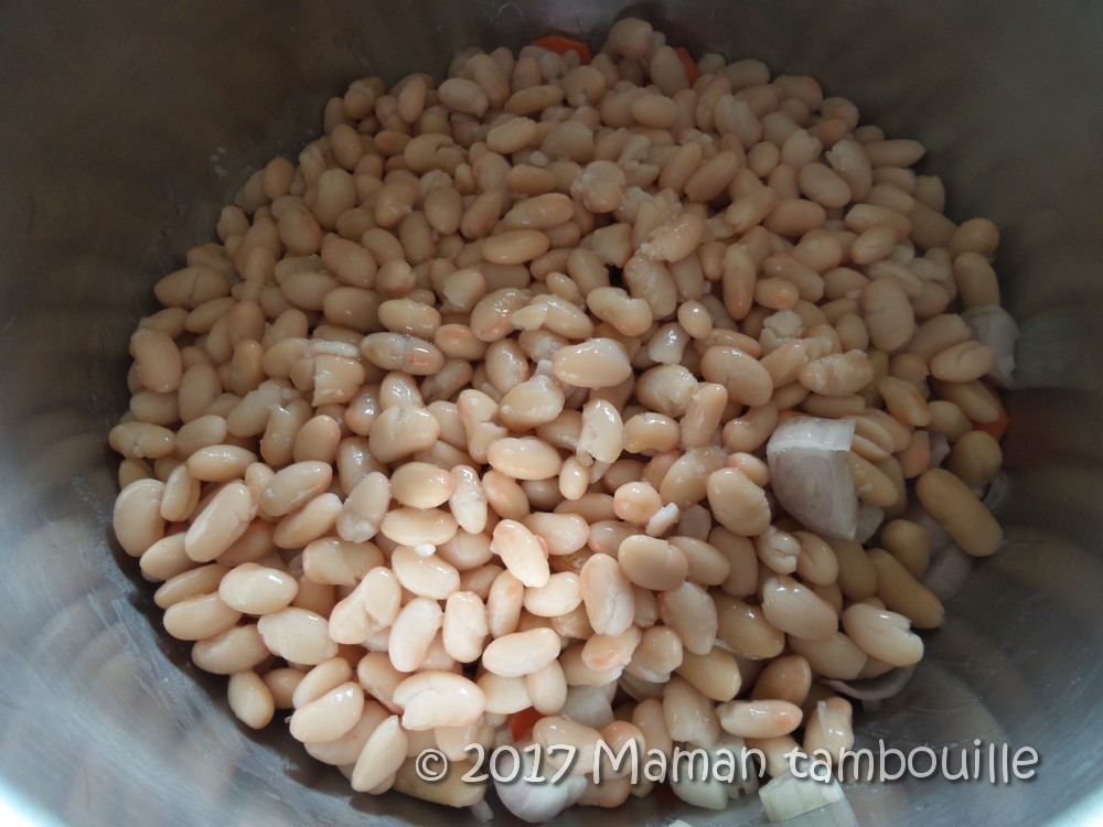 - 2 grosses boites (500g) de haricots blancs cuits au naturel (les plus courageux prépareront eux mêmes les haricots secs en les faisant tremper une nuit, en les cuisant longtemps, longtemps … Pour ma part, les haricots déjà cuits en conserve ou en bocal ont largement fait l’affaire.)