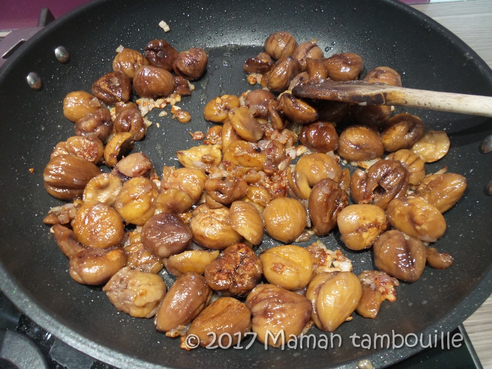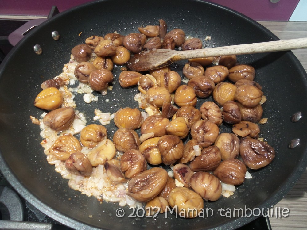 Ajouter les châtaignes et laisser mijoter à feu doux 10 min. Attention que les échalotes ne colorent pas trop.