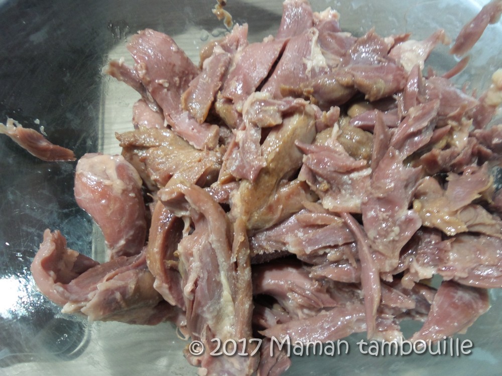 Récupérer la chair de canard sur chaque cuisse et mettre dans un plat.