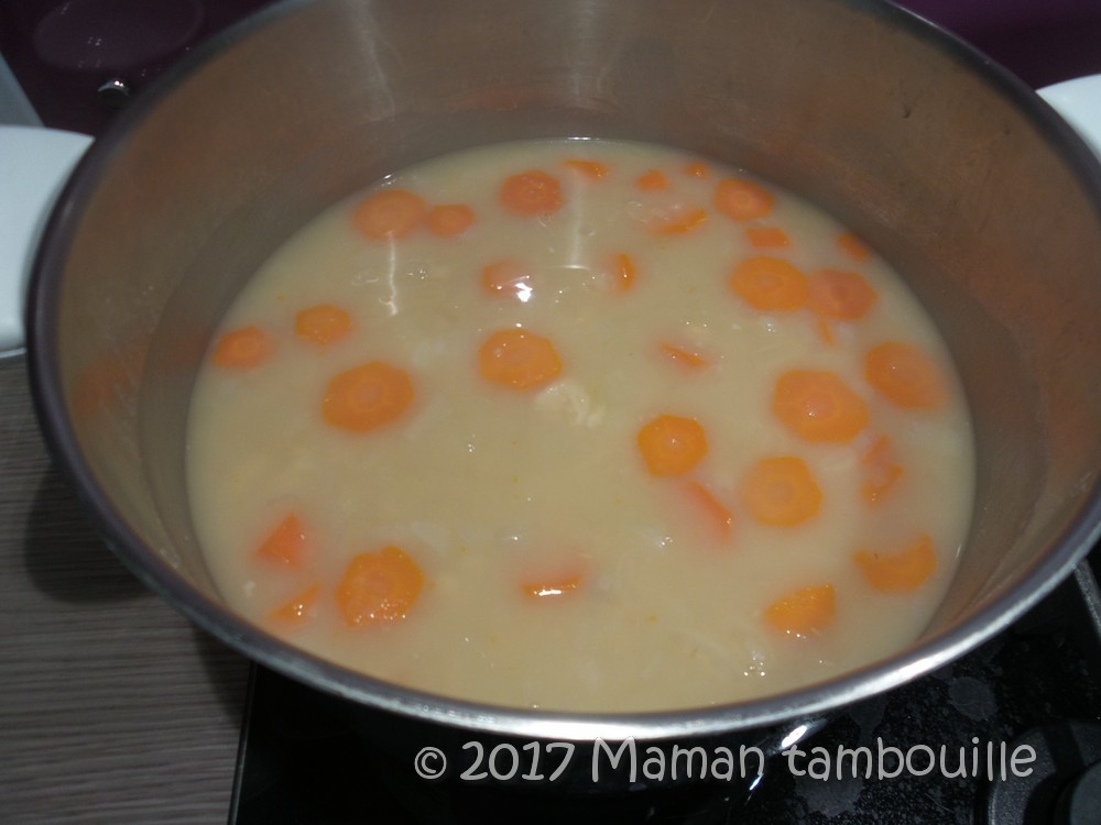 Quand les carottes sont bien tendres, Retirer 4 ou 5 louches du jus de cuisson et réserver dans un saladier.