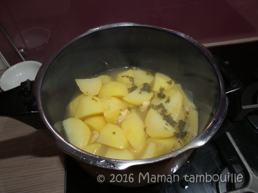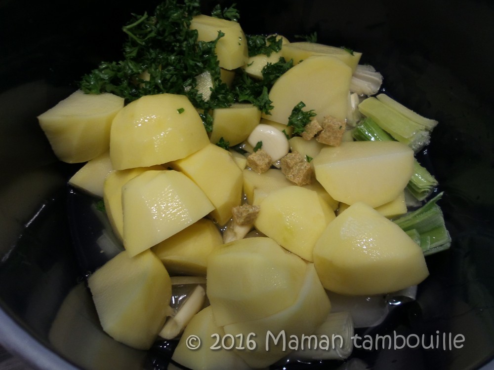 Eplucher les pommes de terre et les couper en morceaux. Les mettre dans un auto cuiseur avec les poireaux émincés, les gousses d’ail épluchées et le persil.