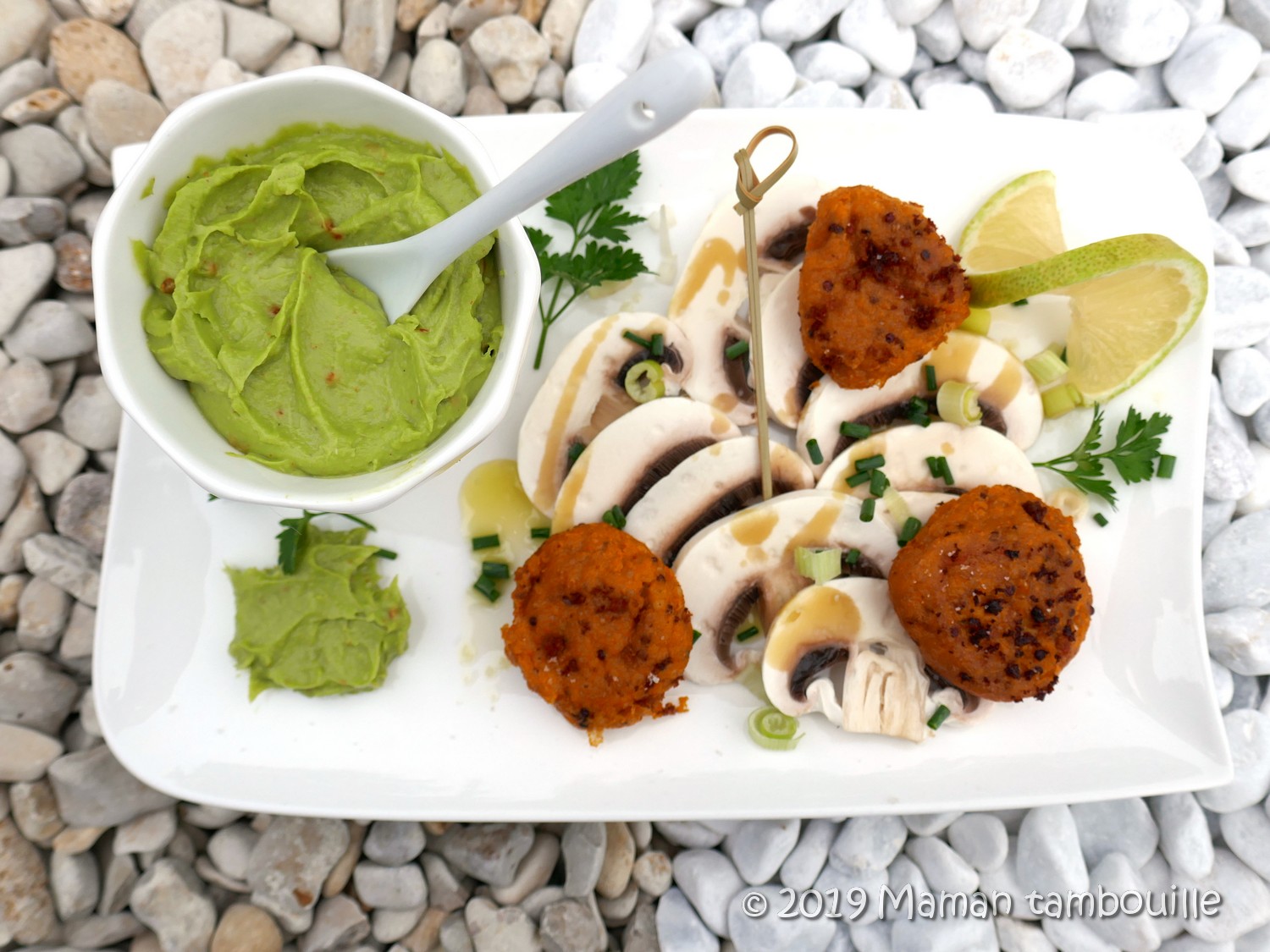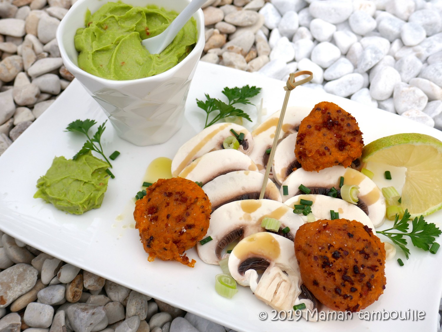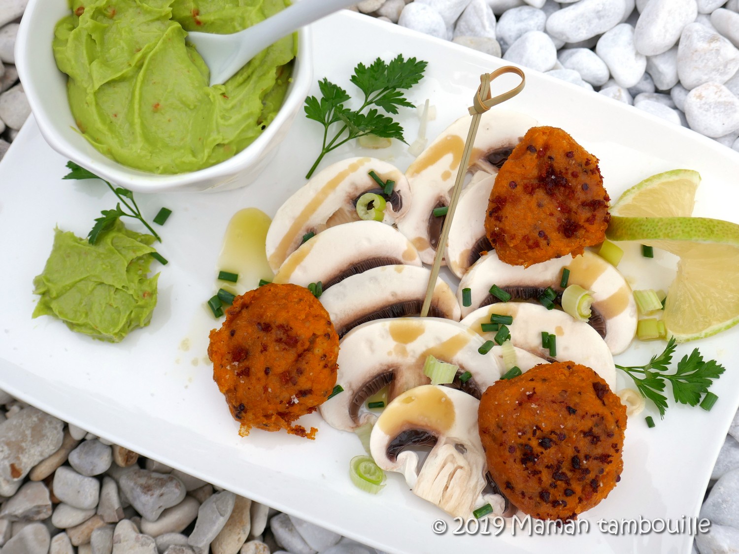 Servir les croquettes bien chaudes avec les champignons émincés assaisonnés d’un filet d’huile d’olive, de quelques gouttes de citron et de fleur de sel. Tremper les croquettes dans le guacamole.